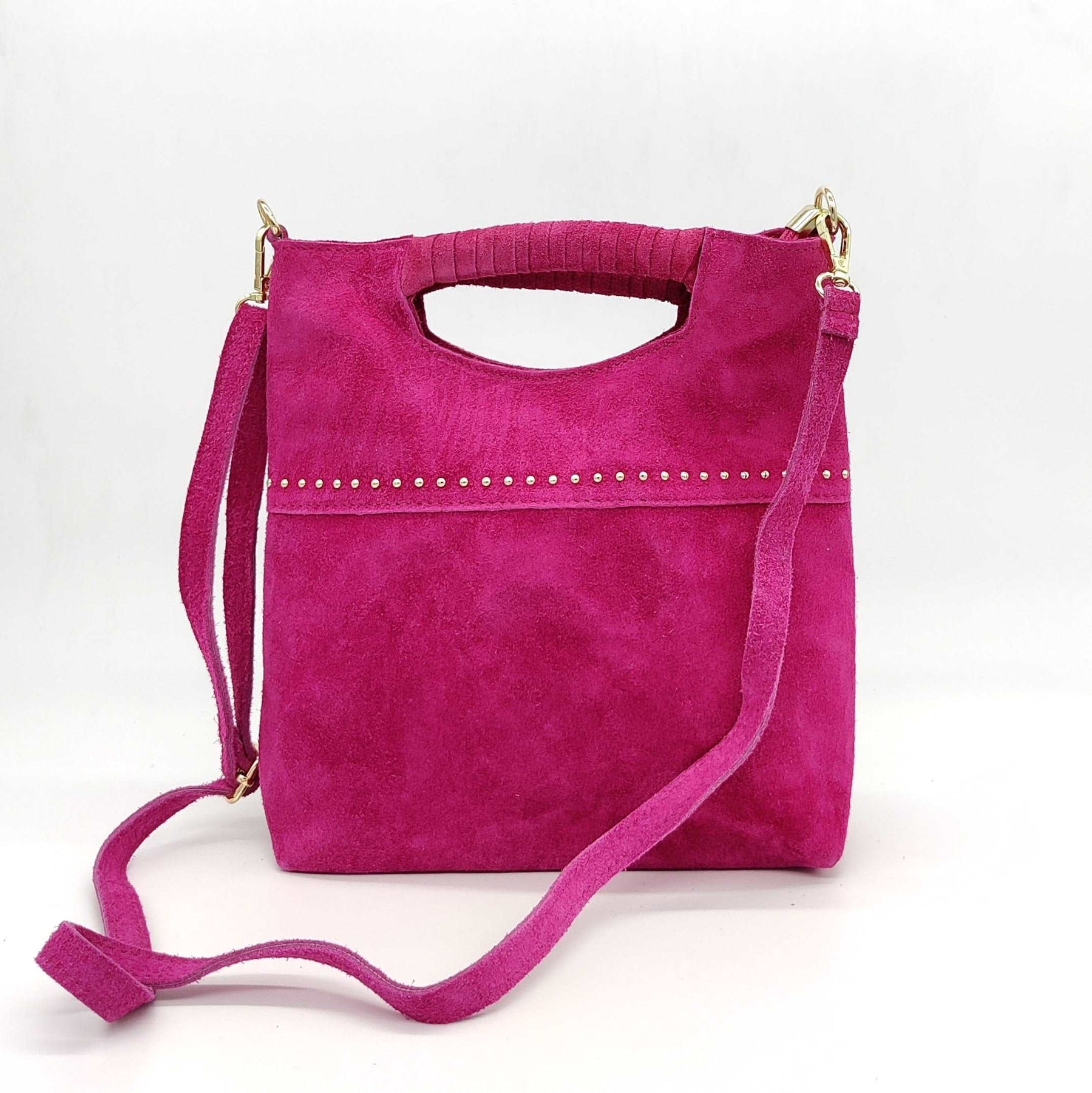 Bolso de ante mediano y cuadrado, con asa de mano y correa bandolera ajustable.