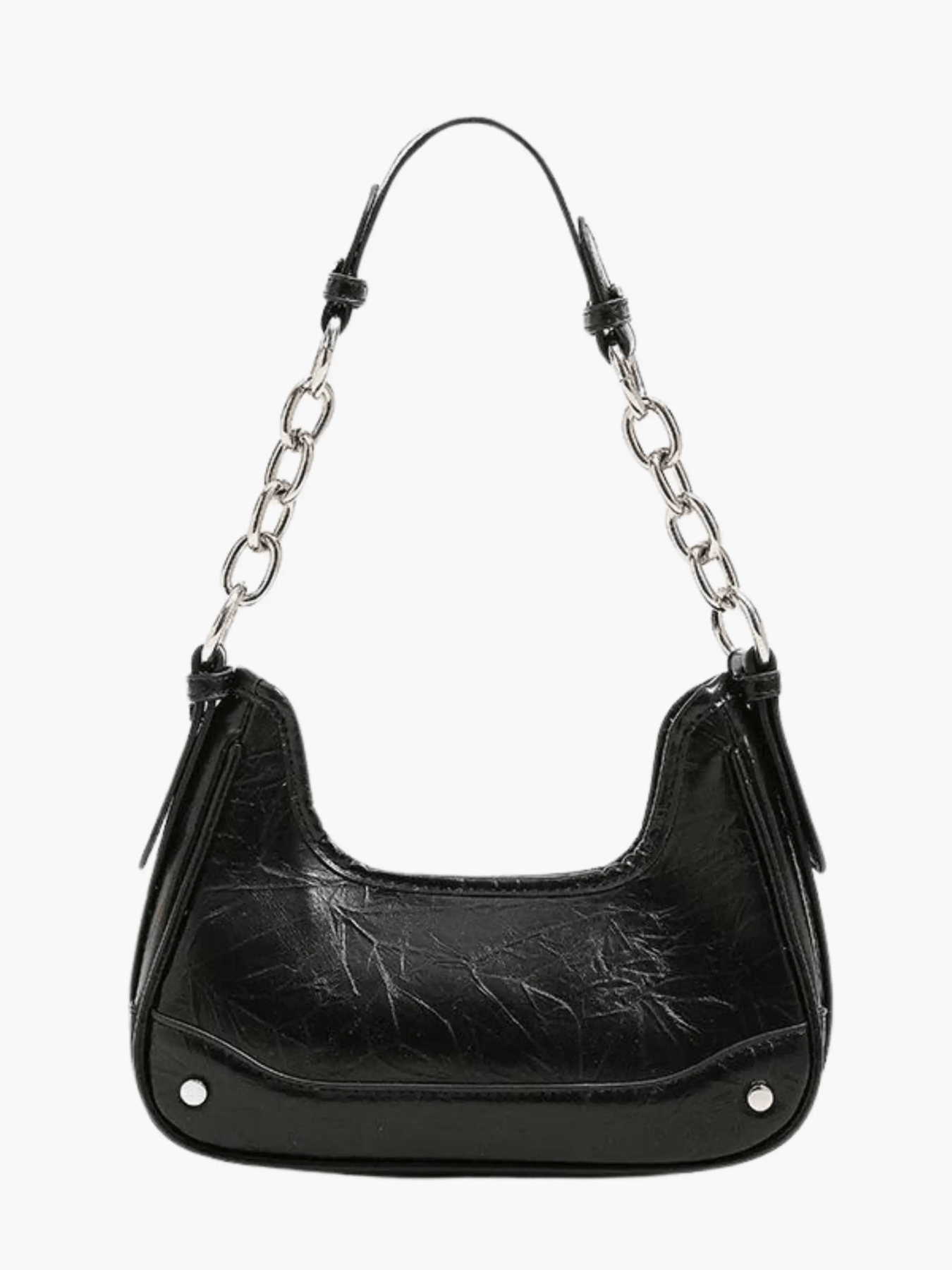 Este bolso de hombro de mezclilla con cadena plateada combina estilo casual con un toque moderno. Su diseño compacto permite llevar lo esencial sin sacrificar el estilo, mientras que la cadena metálica gruesa le da un aire contemporáneo.