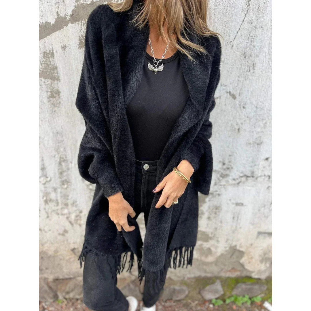 Cárdigan de largo medio con flecos y dobladillo abierto