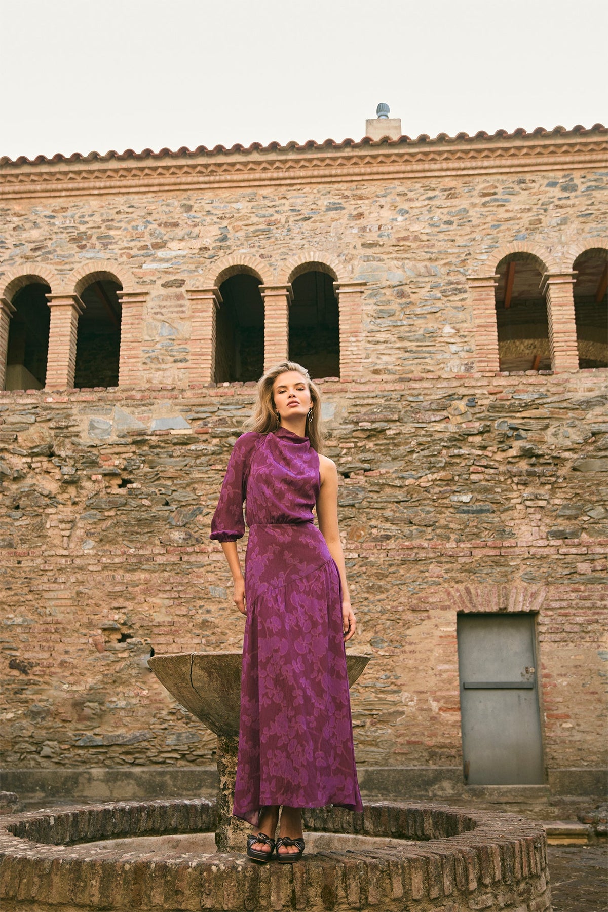 Un diseño femenino y lleno de encanto. Este vestido largo destaca por su hombro al descubierto, que aporta un toque elegante y moderno, mientras que el pequeño volante en el bajo da movimiento y frescura a la prenda. Su estampado floral en tonos rosas lo convierte en la opción perfecta para ocasiones especiales.