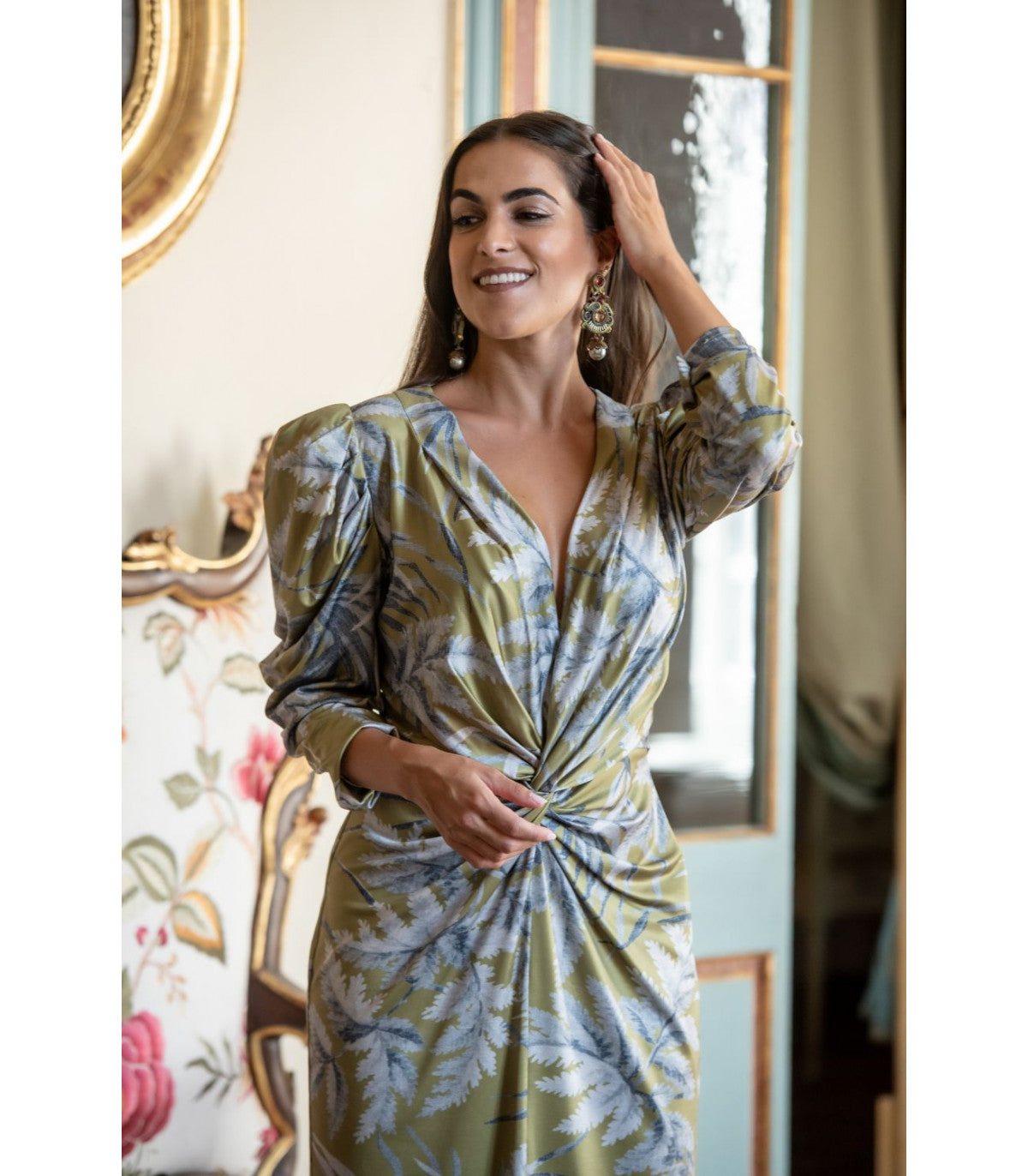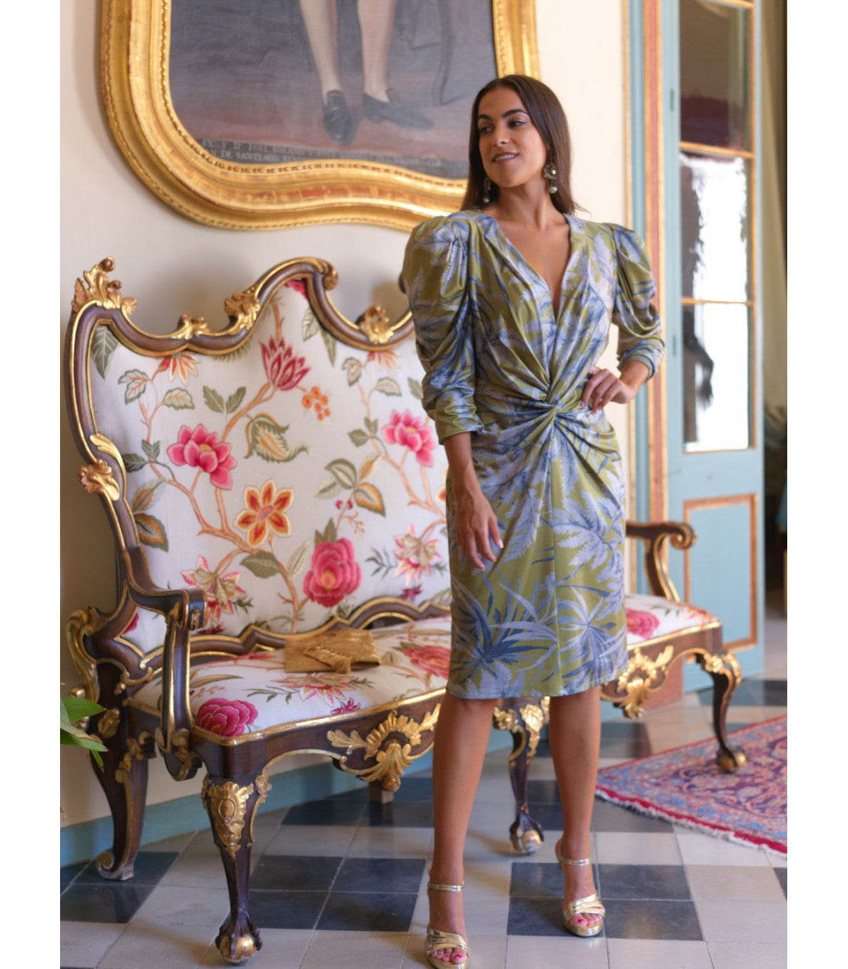 Un diseño moderno y favorecedor que no pasa desapercibido. Este vestido combina un fondo beige con manchas en azulina y negro, logrando un estampado animal print sofisticado y en tendencia. Su escote de pico cruzado con nudo en la cintura estiliza la figura, mientras que la manga francesa tipo jamón añade un toque de volumen y elegancia.