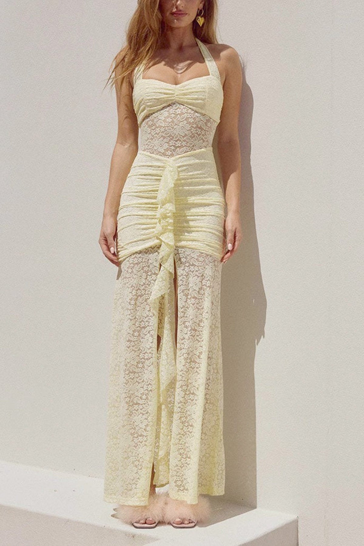 Diseño Exclusivo: Escote halter, encaje delicado y abertura sutil para un look sofisticado.