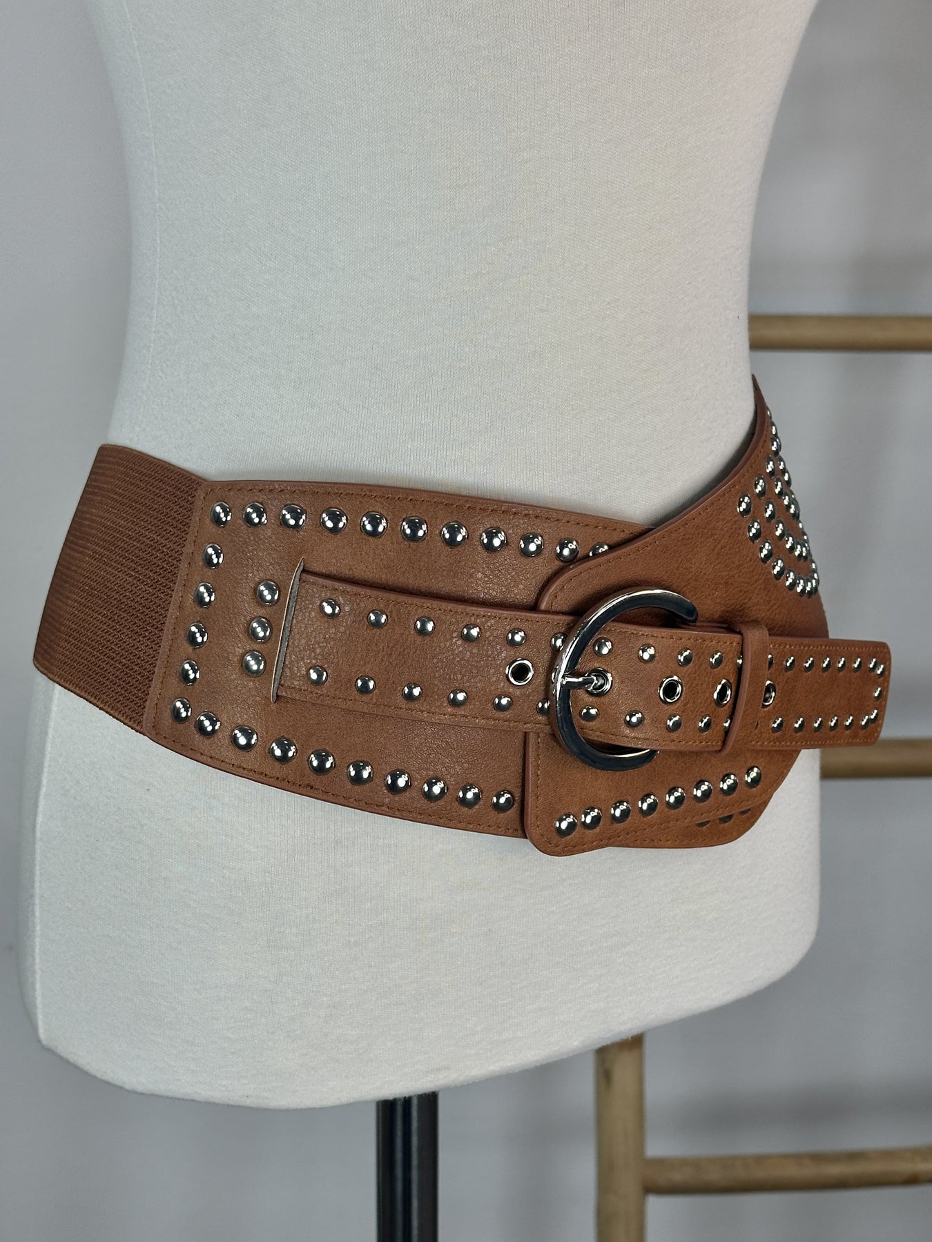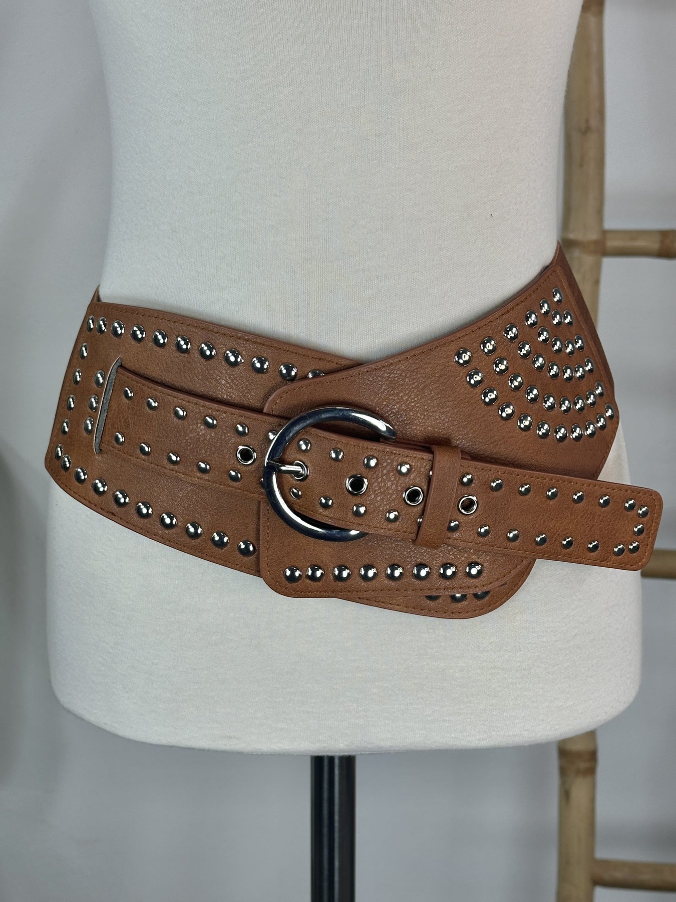 Este cinturón de tachas lo tenemos disponible en color camel.