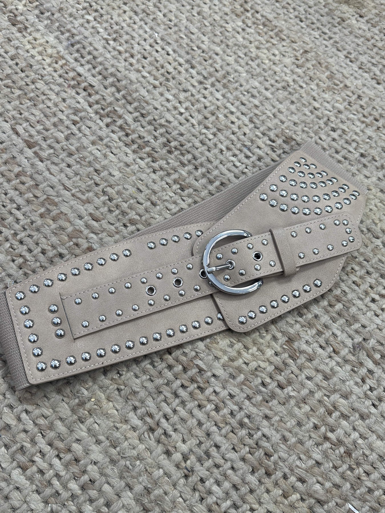 Cinturón fajín ancho con tachuelas y elástico en la parte trasera.